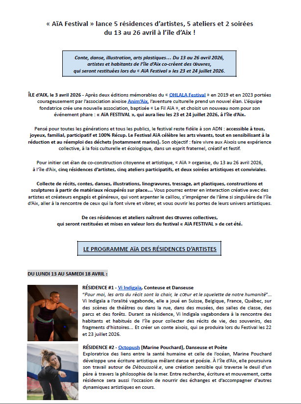 « AïA Festival » lance 5 résidences d’artistes, 5 ateliers et 2 soirées du 13 au 26 avril à l’île d’Aix !