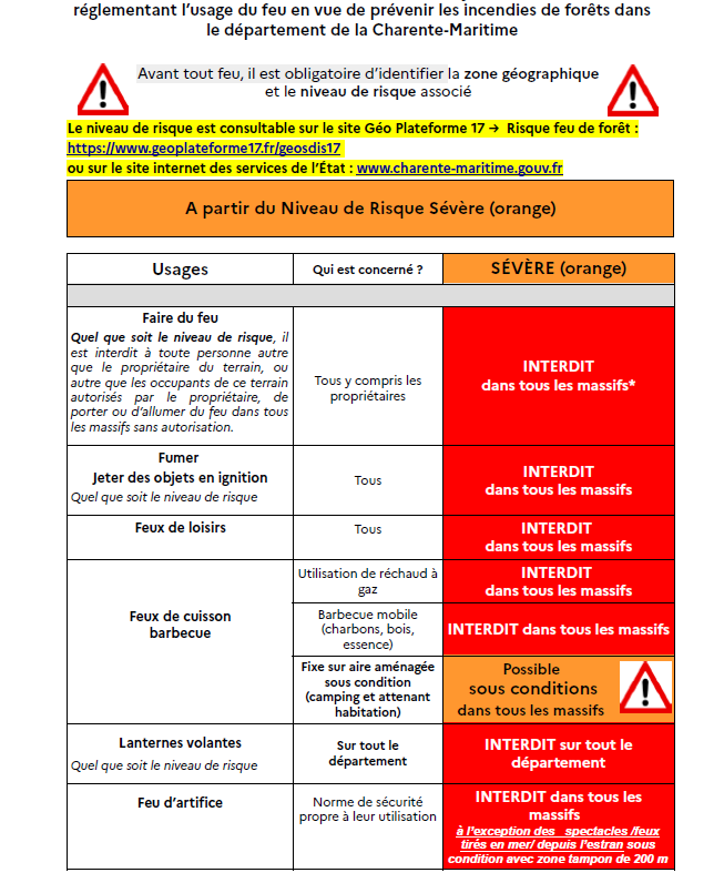 L’arrêté préfectoral du 01/07/2024 « réglementant l’usage du feu en vue de prévenir les incendies de forêts et d’espaces naturels dans le département de la Charente-Maritime » est actuellement en vigueur.